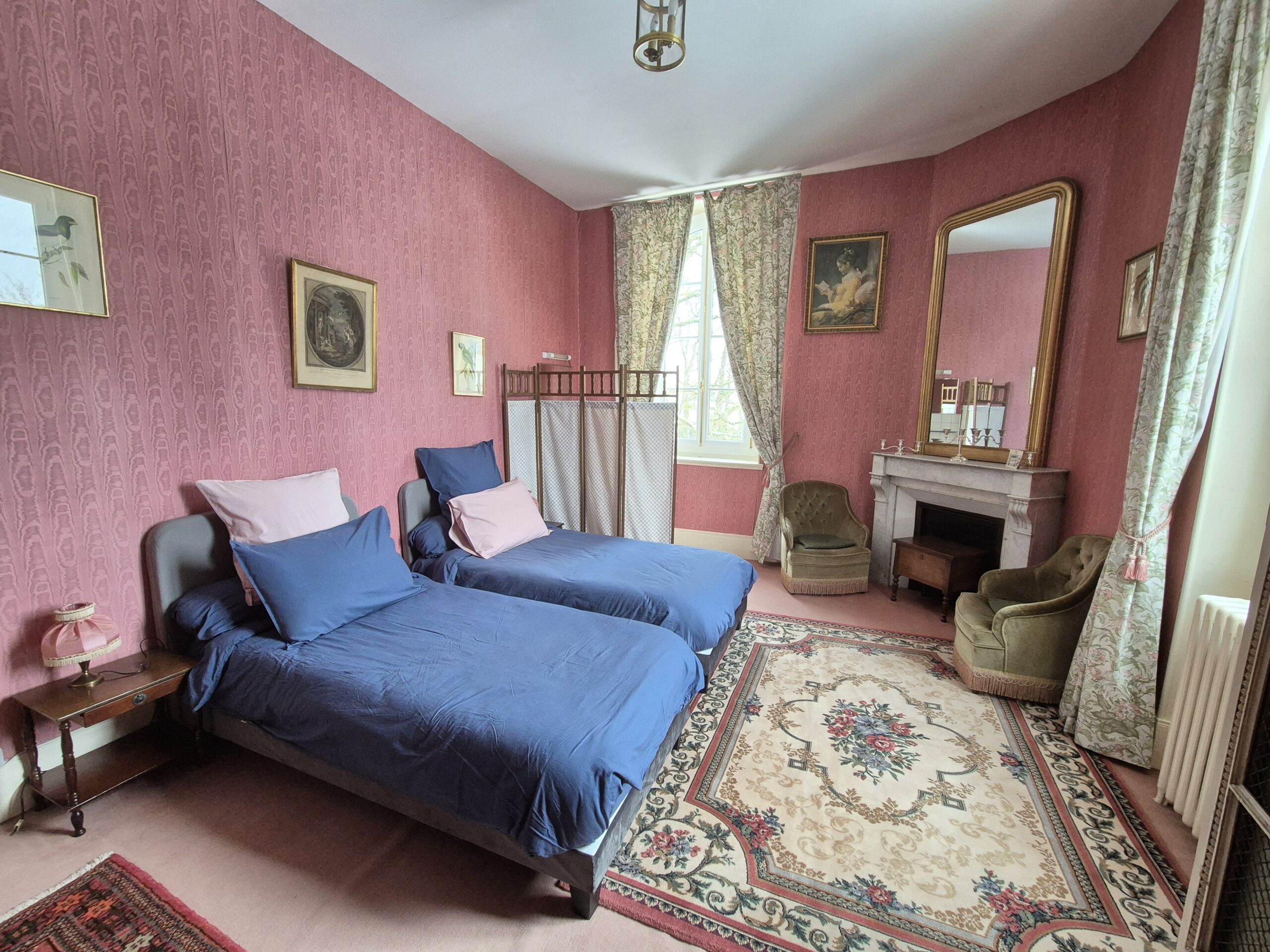 Située au premier étage, la suite d'Hervé peut accueillir jusqu'à quatre personnes. Cette suite, composée de deux chambre, l'une avec son lit double de 160cm, la seconde avec ses deux lits simples, vous offre une large vue sur le parc du manoir. Elle est dotée de fenêtres à double vitrage pour vous garantir une atmosphère calme et reposante. Elle dispose d'une salle de bain avec baignoire et toilettes.